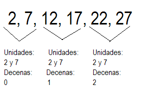 Por otro lado, esta secuencia presenta una regularidad visual. Utilizando los dígitos $2$ y $7$ sigue una secuencia en la que se mantienen estos dígitos en las unidades y se aumenta paulatinamente $1$ decena.