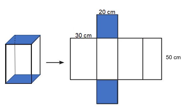 El área de la superficie se calcula $2 \cdot (20\cdot 30+30 \cdot 50+20 \cdot 50)=2 \cdot(600+1\ 500+1\ 000)=2 \cdot 3\ 100= 6\ 200$