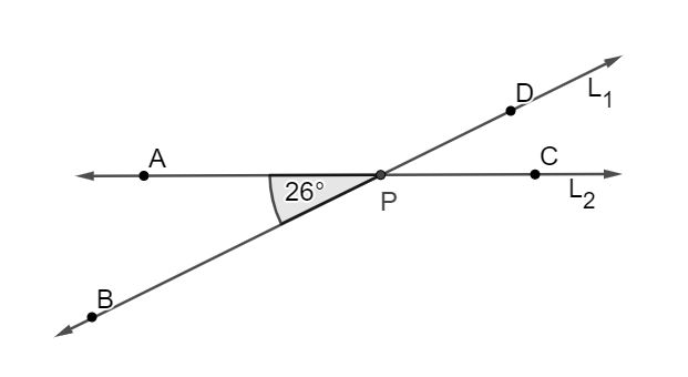 Para que $L_{1} \perp L_{2}$ el $\measuredangle {APB}$ debe medir $90°$,por lo tanto, para saber cuanto debe aumentar el $\measuredangle {APB}$ debemos calcular $90°-26°=64°$