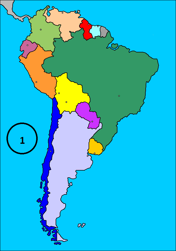 ¿A qué océano corresponde el número 1 marcado en el mapa de Sudamérica?