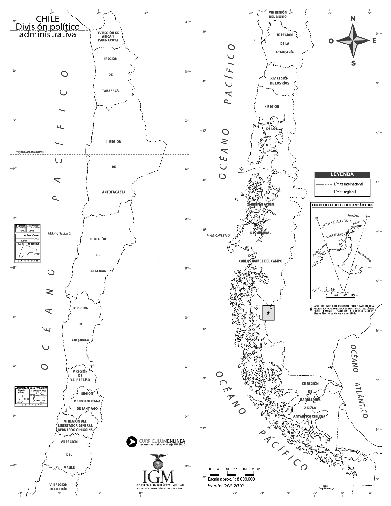 Identificar a Chile en mapas, incluyendo la cordillera de los Andes, el océano Pacífico, su región, su capital y su localidad.