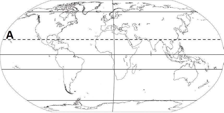 La línea punteada que tiene la letra A corresponde al Trópico de Cáncer, que corresponde a una línea imaginaria que circunvala la toerra a lo largo del paralelo de latitud 23° 26' 14'' al norte del Ecuador.