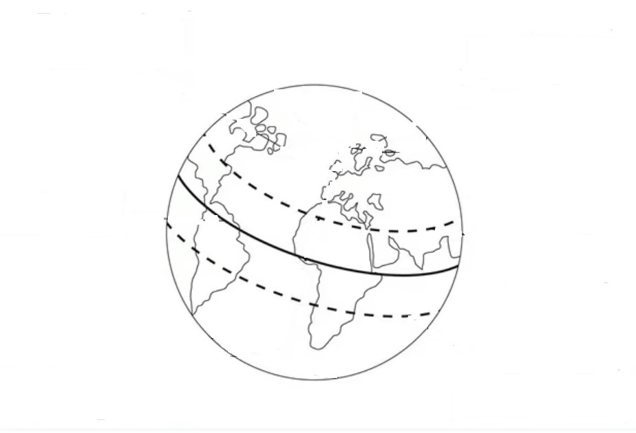 En la imagen están señalados los paralelos que conocemos como: Trópico de Cáncer al norte, trópico de Capricornio al sur y en medio la línea del Ecuador.