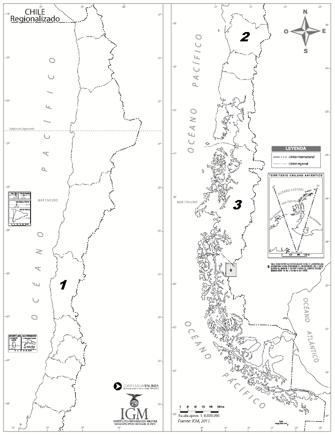 C) 1: Región de Coquimbo; 2: Región de Valparaíso; 3: Región de Magallanes y de la Antártica Chilena.