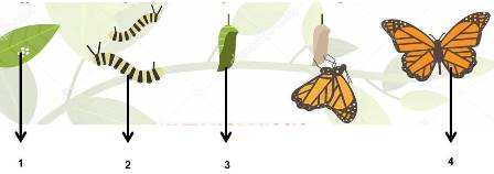 A) 1: huevo; 2: oruga; 3: crisálida; 4: adulto
