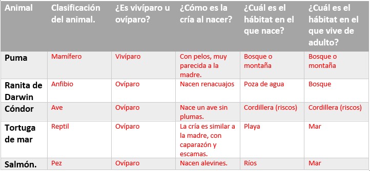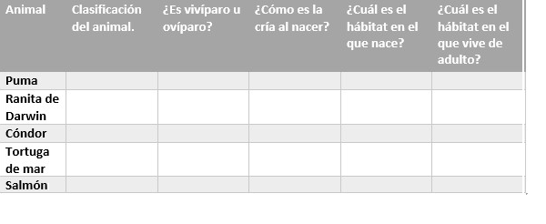 Los animales vertebrados se pueden clasificar en anfibios, reptiles, aves, mamíferos y peces. Completa el siguiente cuadro con los ciclos de vida de los animales vertebrados, indicando también cómo se clasifican estos vertebrados (anfibio, reptil, ave, mamífero, pez).