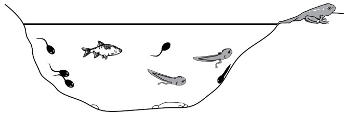 Marcela encontró algunos renacuajos y peces en una laguna, como se muestra en la siguiente imagen.
