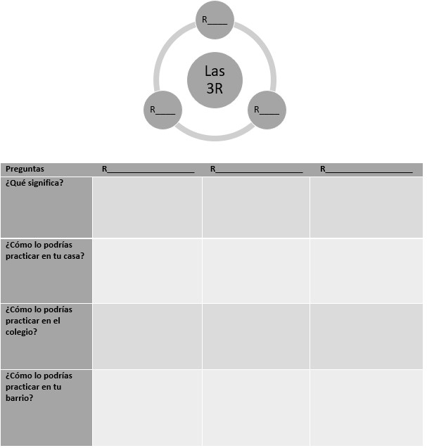 El uso responsable de los recursos naturales y no naturales, y el cuidado del planeta son aspectos muy importantes para el desarrollo humano. Es por esto que se promueve la práctica las "3R" de la ecología. Completa cada una de las "3R" en el cuadro que se muestra acontinuación: