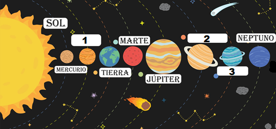 A continuación se presenta una imagen del Sistema Solar, ¿cuáles son los nombres de los planetas 1, 2 y 3 que están señalados en la imagen?