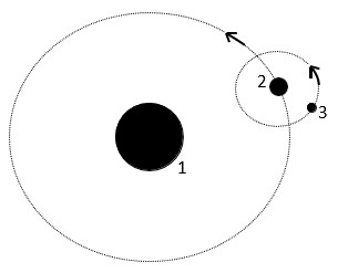 La siguiente imagen muestra la Tierra, la Luna y el Sol. Cada uno de ellos se representa con un número en la imagen y las flechas muestran la dirección en la que se mueven.