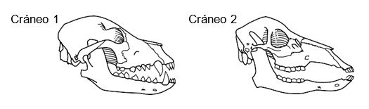 En la imagen se muestran dos figuras, el Cráneo 1 y el Cráneo 2, estos son representativos de dos animales que poseían distintas formas de alimentarse. Uno de esos animales solo comía plantas, mientras que el otro solo comía animales. A partir de la figura y la información entregada responda: