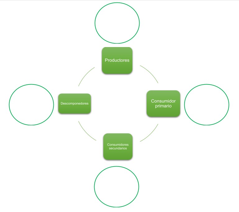 A continuación, se presenta un esquema que representa el flujo de la materia entre diferentes organismos que son parte de una cadena alimentaria. Complete los recuadros en blanco con el nombre de organismos que podemos encontrar en el país y que cumpla con la función señalada en su ecosistema.