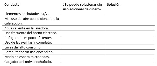 | Conducta | ¿Se puede solucionar sin uso adicional de dinero? | Solución |
