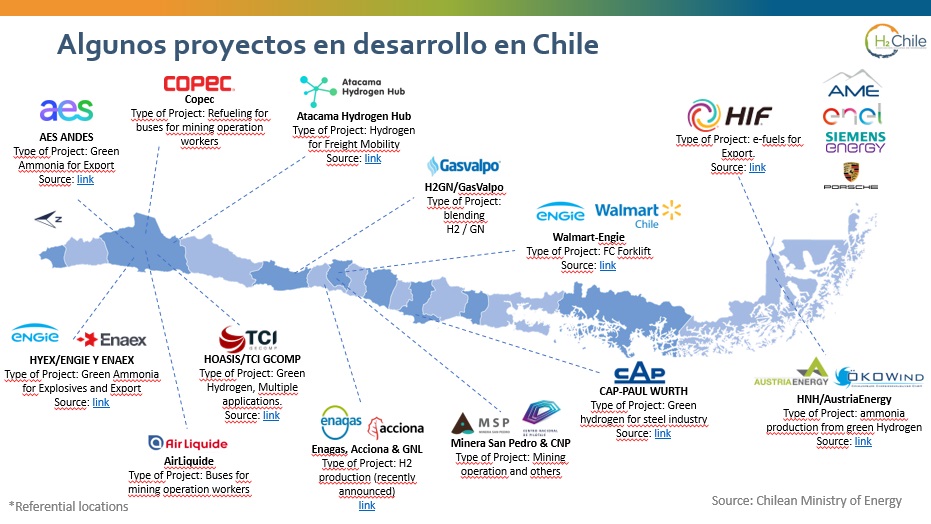 En el 2021 la cartera de proyectos de hidrógeno verde en Chile se ha triplicado en comparación a noviembre 2020, pasando de 20 a 60 proyectos. Actualmente existen dos plantas produciendo moléculas de H2V en nuestro país. Enel Green Power y Enap, desde el 2017, en la región de Atacama y la segunda con la inauguración de la planta de AngloAmerican para alimentar con H2V maquinaria de faenas mineras.