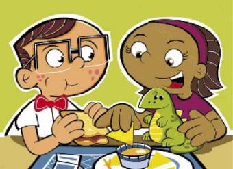 Cuento que describe las aventuras de una niña que tiene un accidente en el comedor de la escuela, al llevar su bandeja a la mesa.