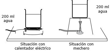 Habitualmente, en el laboratorio de ciencias hay dos fuentes de calor disponibles: un calentador eléctrico y un mechero. Una estudiante planeó una investigación para probar cuál de estas fuentes calienta más rápido el agua. Luego, realizó el siguiente procedimiento experimental: puso en dos vasos de precipitados, de igual tamaño y material, 200 mL de agua y registró la temperatura inicial del agua en cada uno de ellos.