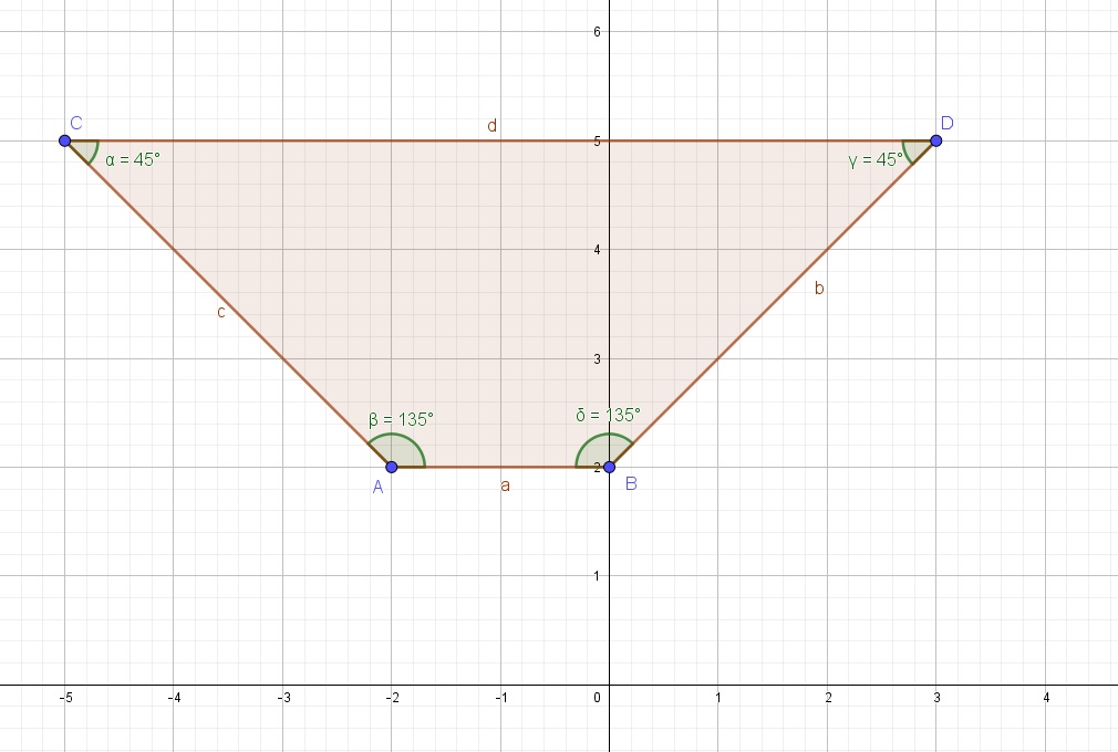 En la siguiente imagen podemos corroborar que para que se cumpla la condición de ser un trapecio isósceles el punto D debe tener coordenadas (3,5)