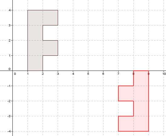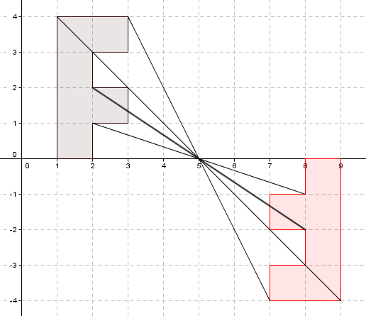 - al realizar una simetría central respecto al origen, también es posible obtener F´. La distancia que hay entre cada punto de F y el origen es la misma que hay entre cada punto correspondiente de F´ y el origen. Esto, haciendo la correspondencia entre cada uno de los puntos de la figura.
