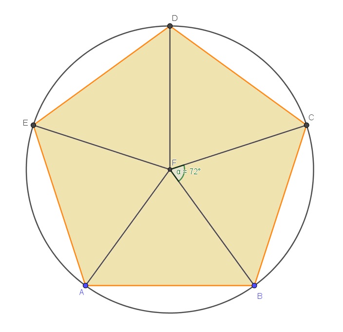 Al unir los vértices del pentágono con el centro de la circunferencia donde está inscrito se forman 5 triángulos congruentes, tal como se muestra en la figura: