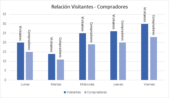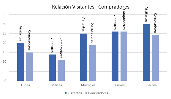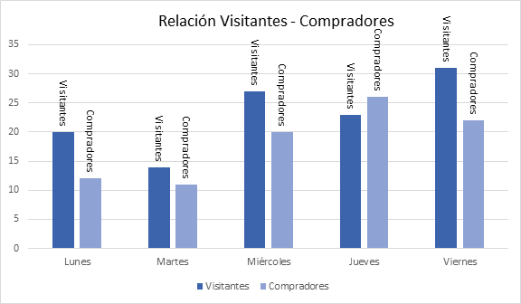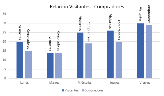 La tabla muestra la cantidad de visitantes y compradores de una tienda durante la semana pasada, de Lunes a Viernes.