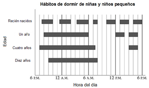 En el siguiente gráfico, se presenta información acerca de los hábitos de dormir de niños y niños durante un periodo de tiempo, en la que, cada barra compacta representa un período de sueño.