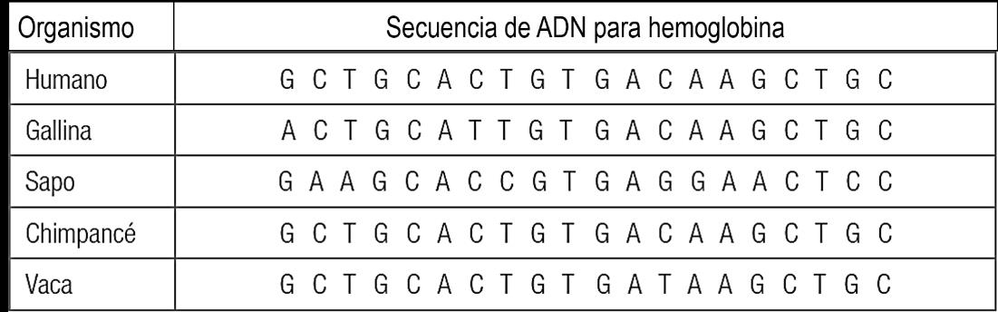 Una de las bases científicas de la teoría sintética de la evolución es la genética, esta permite comparar secuencias de ADN de distintas especies. En la siguiente tabla se compara un mismo segmento de la secuencia que codifica para la proteína hemoglobina de cinco especies distintas: