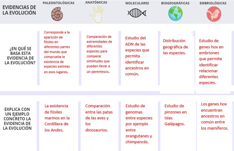 Existen diferentes evidencias de que la evolución de las especies realmente ocurrió. Completa el cuadro de las evidencias de la evolución.