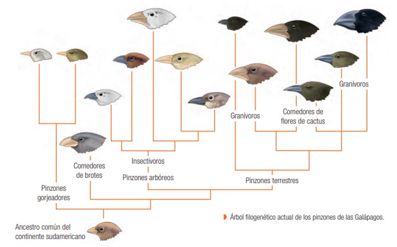 Un árbol filogenético es un esquema con ramificaciones (arborescente) que muestra las relaciones evolutivas que pueden tener varias especies. A partir de lo anterior, analiza el árbol filogenético de los pinzones de Galápagos.