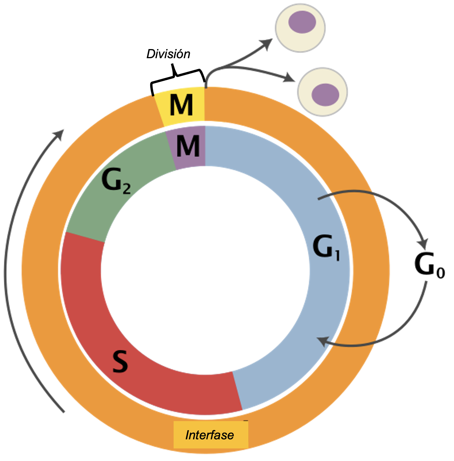 El ciclo celular es un proceso ampliamente regulado que consta de cuatro etapas principales: G1 etapa de crecimiento; S donde se replica el ADN; G2 de preparación para la división celular y M donde se produce la mitosis.