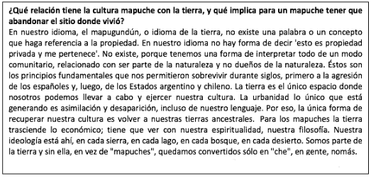 Si leemos las últimas líneas del texto, notaremos que el mismo Mauro Millán señala que la tierra traspasa un asunto económico para los mapuches, sino que tiene que ver con factores culturales e incluso espirituales. Como son "gente de la tierra", y ello significa vivir en armonía con ese espacio, los procesos de urbanización que tienden a modificar bruscamente el espacio han alterado sus tradiciones, provocando procesos de asimilación y pérdida de identidad. El resto de las alternativas son incorrectas, puesto que si bien aparecen de una u otra forma en el texto expresadas como ideas, no responden a la pregunta que específica por la relación entre tierra y mapuche.