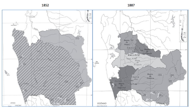 Fuente: José Ignacio González Leiva y Patricio Bernedo Pinto "Cartografía de la transformación de un territorio: La Araucanía 1852-1887". Revista de Geografía Norte Grande 54: 179-198 (2013).