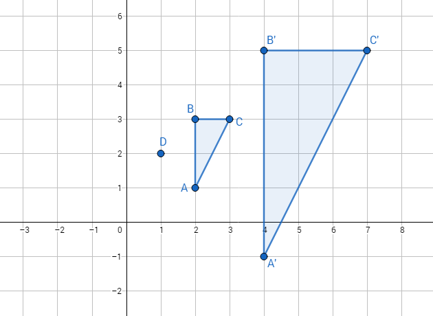 Al triángulo $\Delta$ ABC se le aplicó una homotecia con centro en D, obteniéndose el triángulo $\Delta$ A´B´C´.