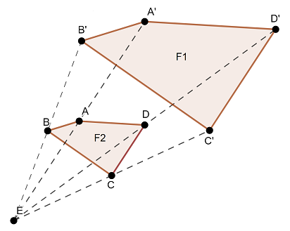 En la siguiente imagen la figura F2 se obtuvo aplicando una homotecia de centro E y factor $k$ a la figura F1.