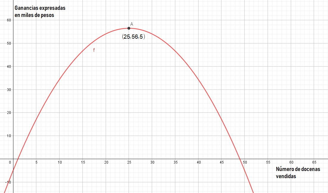 El vértice (punto máximo) de la función está en $ (25; 56,5) $, por lo tanto, cuando se venden más de $ 25 $ docenas (rama derecha de la función cuadrática) las ganancias comienzan a decrecer.