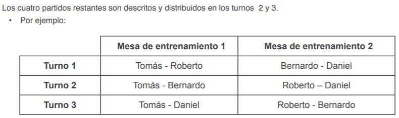 Tomás, Roberto, Bernardo y Daniel formaron un grupo de entrenamiento en un club de ping-pong. Cada jugador desea jugar una vez contra cada uno de los otros jugadores. Ellos reservaron dos mesas de entrenamiento para sus partidos.