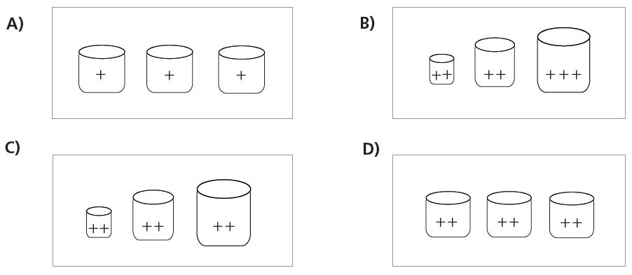 Si la cantidad de reactantes (en estado gaseoso) se representa con signos +, ¿cuál de las siguientes opciones describe un diseño experimental que permita comprobar el efecto de la presión en la rapidez de una reacción química?
