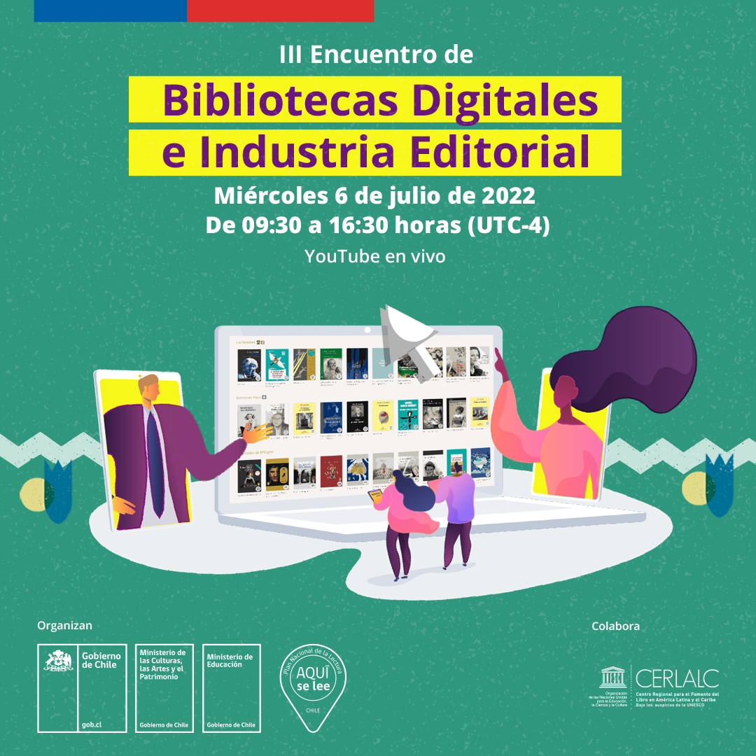 El 06 de julio, desde las 09:30 hasta las 16:30 horas, se llevará a cabo el III Encuentro de Bibliotecas Digitales e Industria Editorial. Dicha actividad se realiza anualmente y tiene por objetivo visibilizar la gestión y resultados de bibliotecas digitales, el uso de recursos tecnológicos asociados a la lectura y el intercambio de ideas en torno a las posibilidades que ofrece la lectura en plataformas digitales de acceso público y gratuito.
