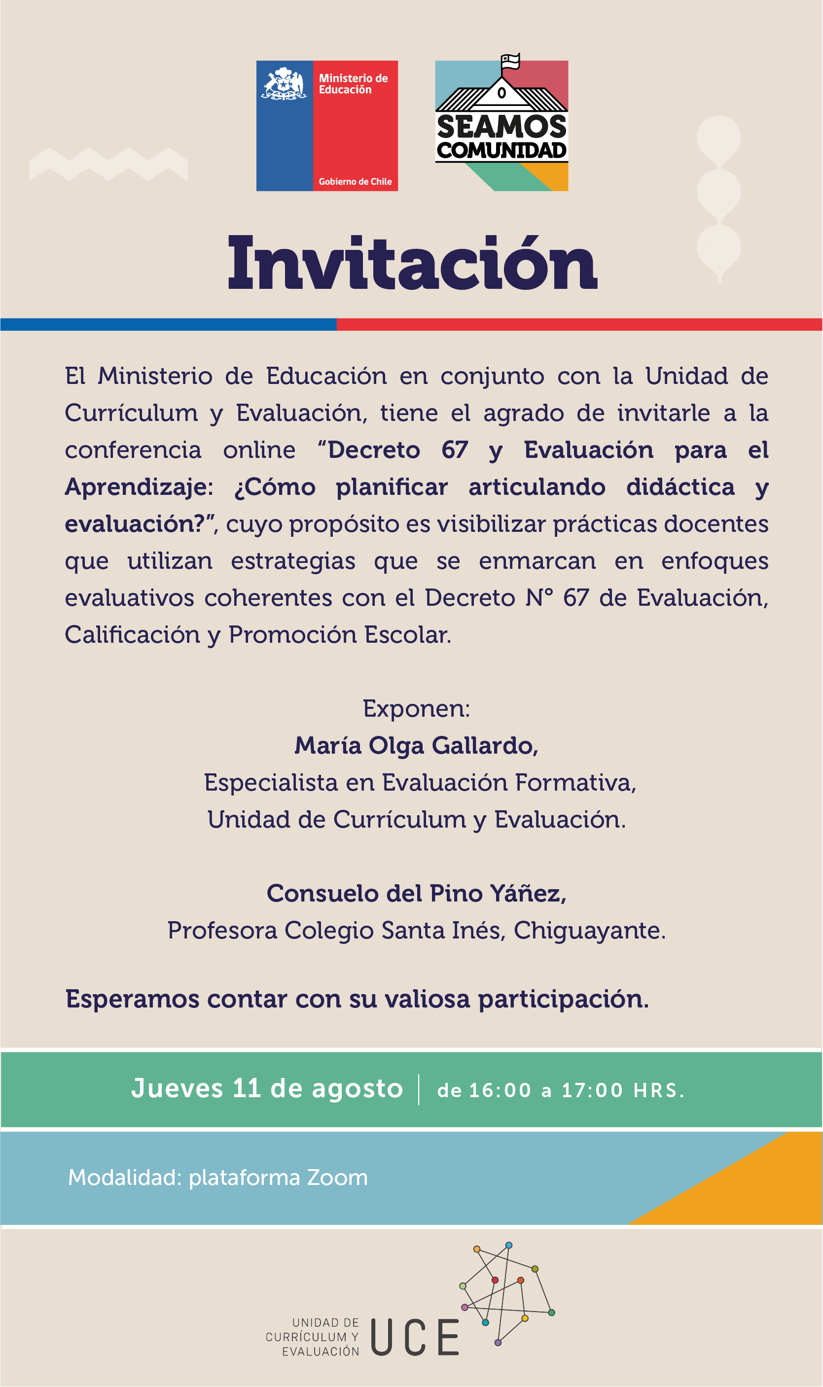 El Ministerio de Educación en conjunto con la Unidad de Currículum y Evaluación, tiene el agrado de invitarle a la conferencia online “Decreto 67 y Evaluación para el Aprendizaje: ¿Cómo planificar articulando didáctica y evaluación?”, cuyo propósito es visibilizar prácticas docentes que utilizan estrategias que se enmarcan en enfoques evaluativos coherentes con el Decreto N° 67 de Evaluación, Calificación y Promoción Escolar.