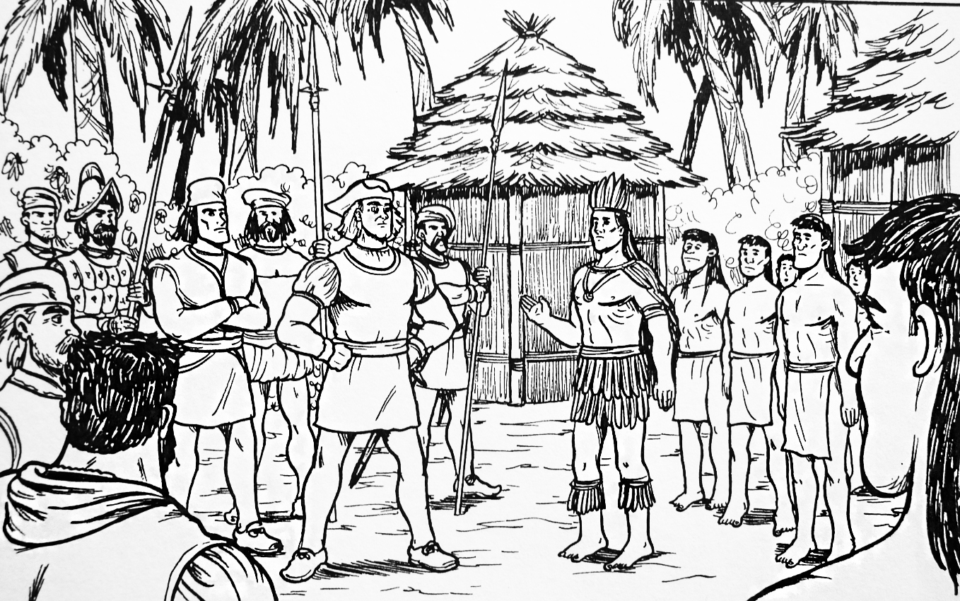 Ilustración que representa el encuentro de Cristóbal Colón con los nativos de América (blanco y negro)