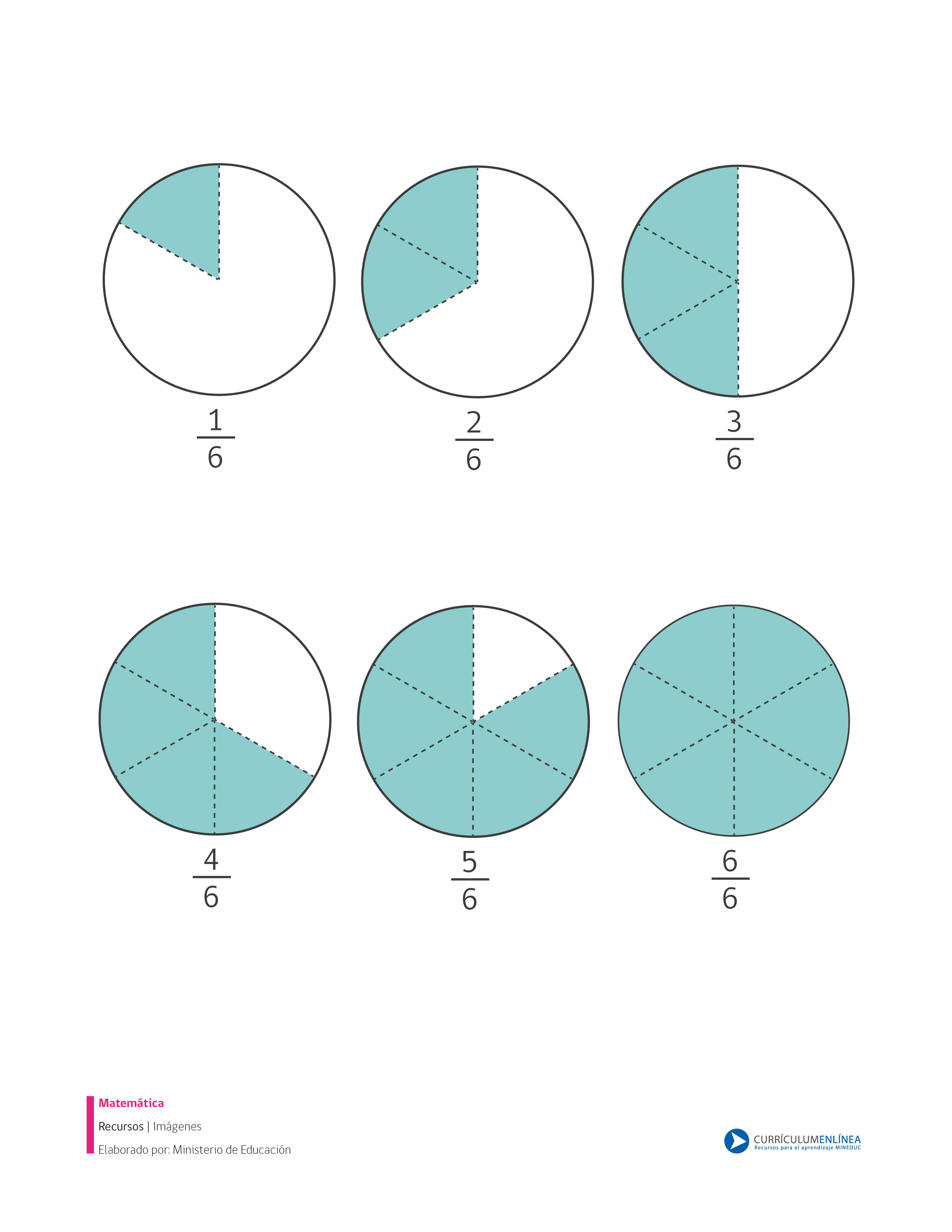 Imagen que muestra fracciones propias con denominador seis que puede ser usada con distintos fines pedagógicos.