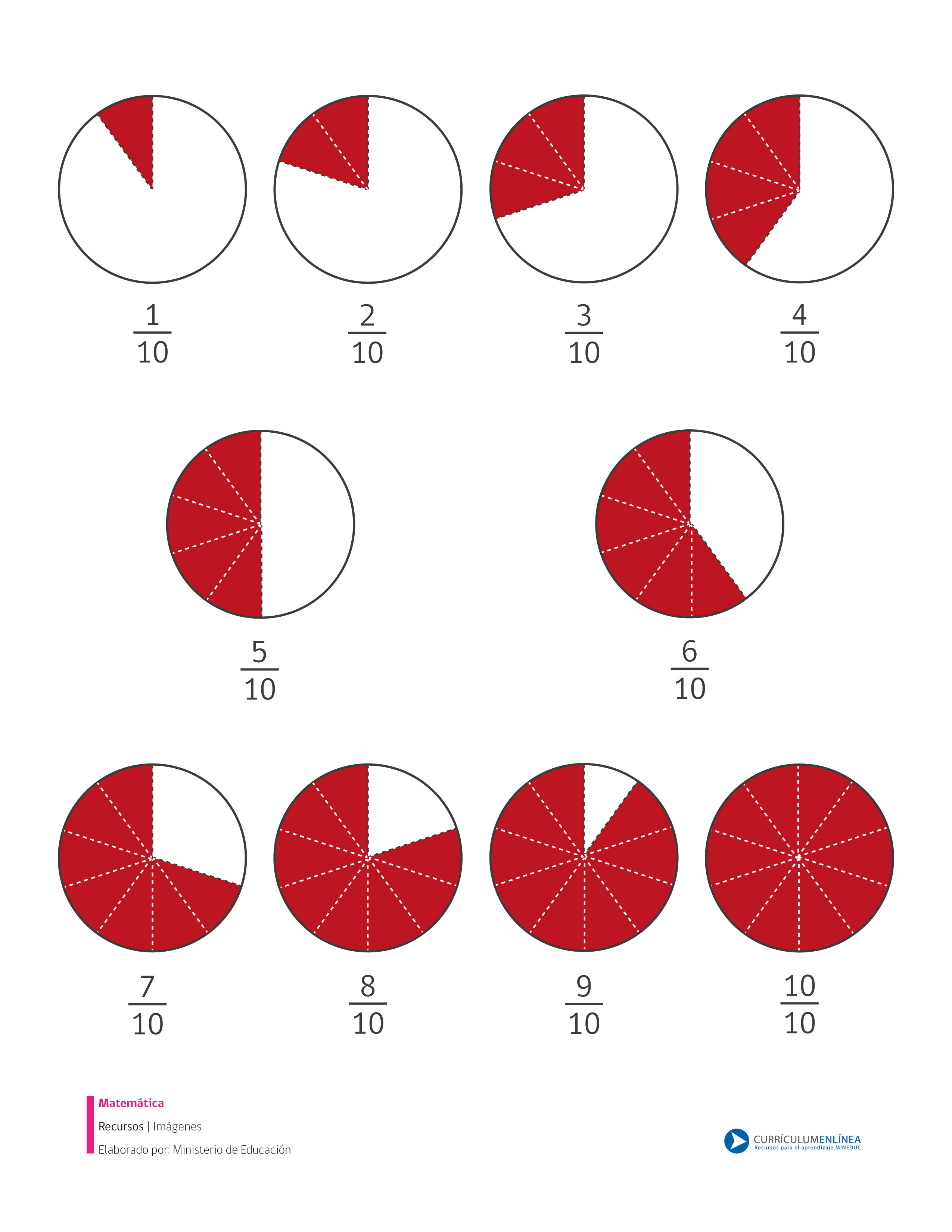 Imagen que muestra fracciones propias con denominador diez que puede ser usada con distintos fines pedagógicos.