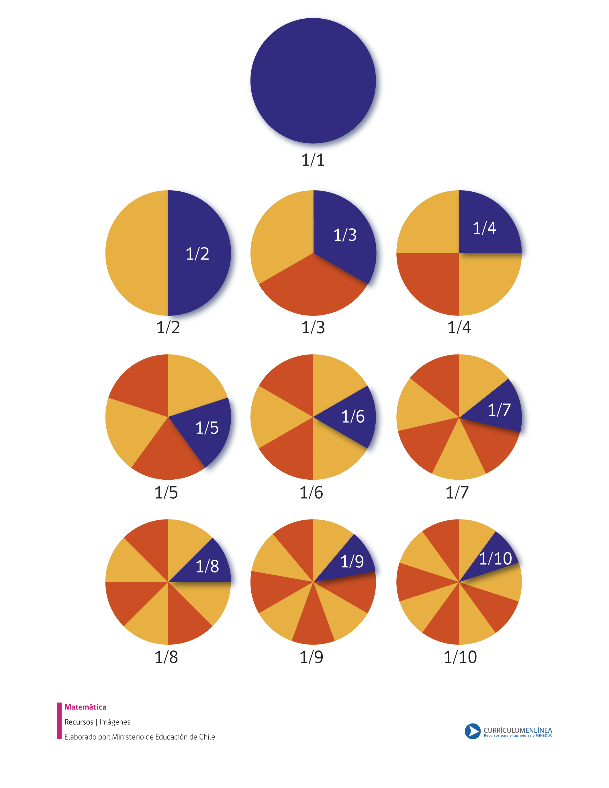 Imagen que muestra las fracciones de la unidad en forma pictórica y simbólica para ser usada con diversos fines pedagógicos.