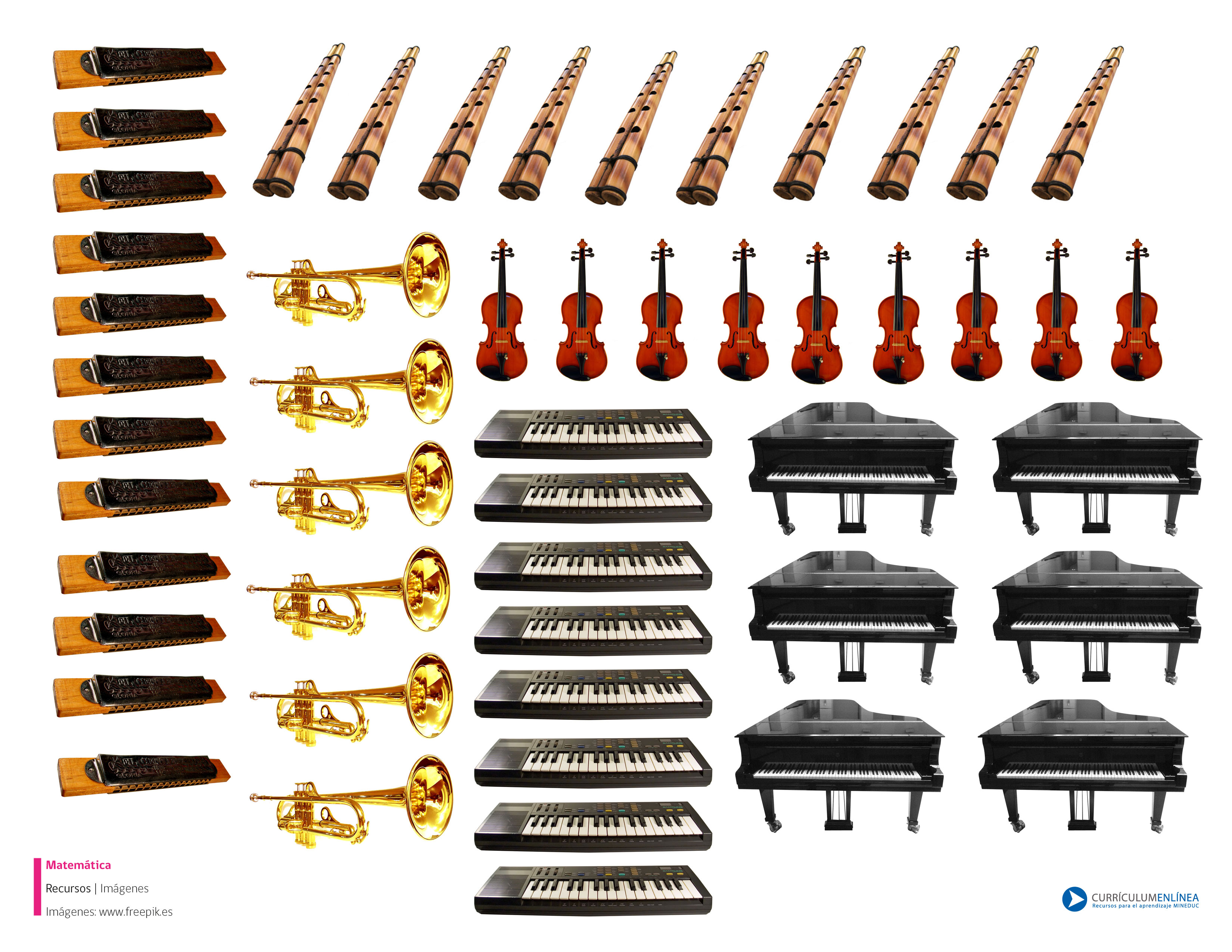 Imagen de diversos instrumentos musicales para recortar que puede ser utilizada con distintos fines pedagógicos, como por ejemplo para contar, escribir la cantidad de instrumentos que hay en cada grupo, realizar comparaciones, crear patrones y descubrir reglas de formación, etc.