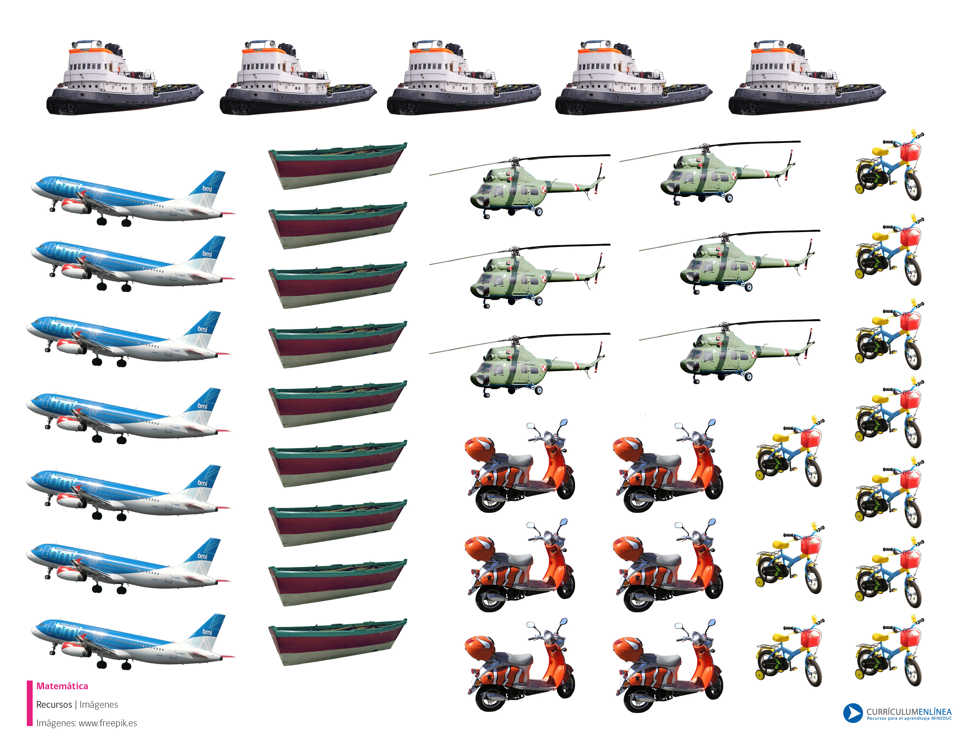 Imagen de diversos medios de transportes para recortar que puede ser utilizada con distintos fines pedagógicos, como por ejemplo para contar, escribir la cantidad de instrumentos que hay en cada grupo, realizar comparaciones, crear patrones y descubrir reglas de formación, etc.