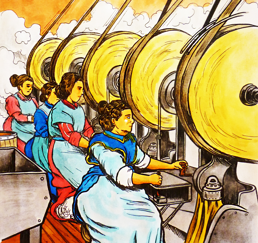 Ilustración que representa el trabajo dentro de una industria durante la revolución industrial (color)