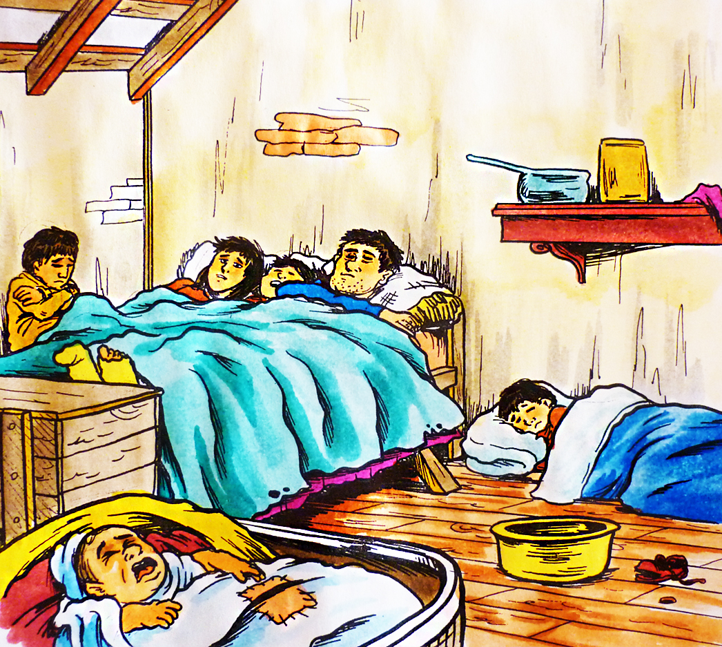 Ilustración que representa las malas condiciones de las viviendas durante la revolución industrial (color)