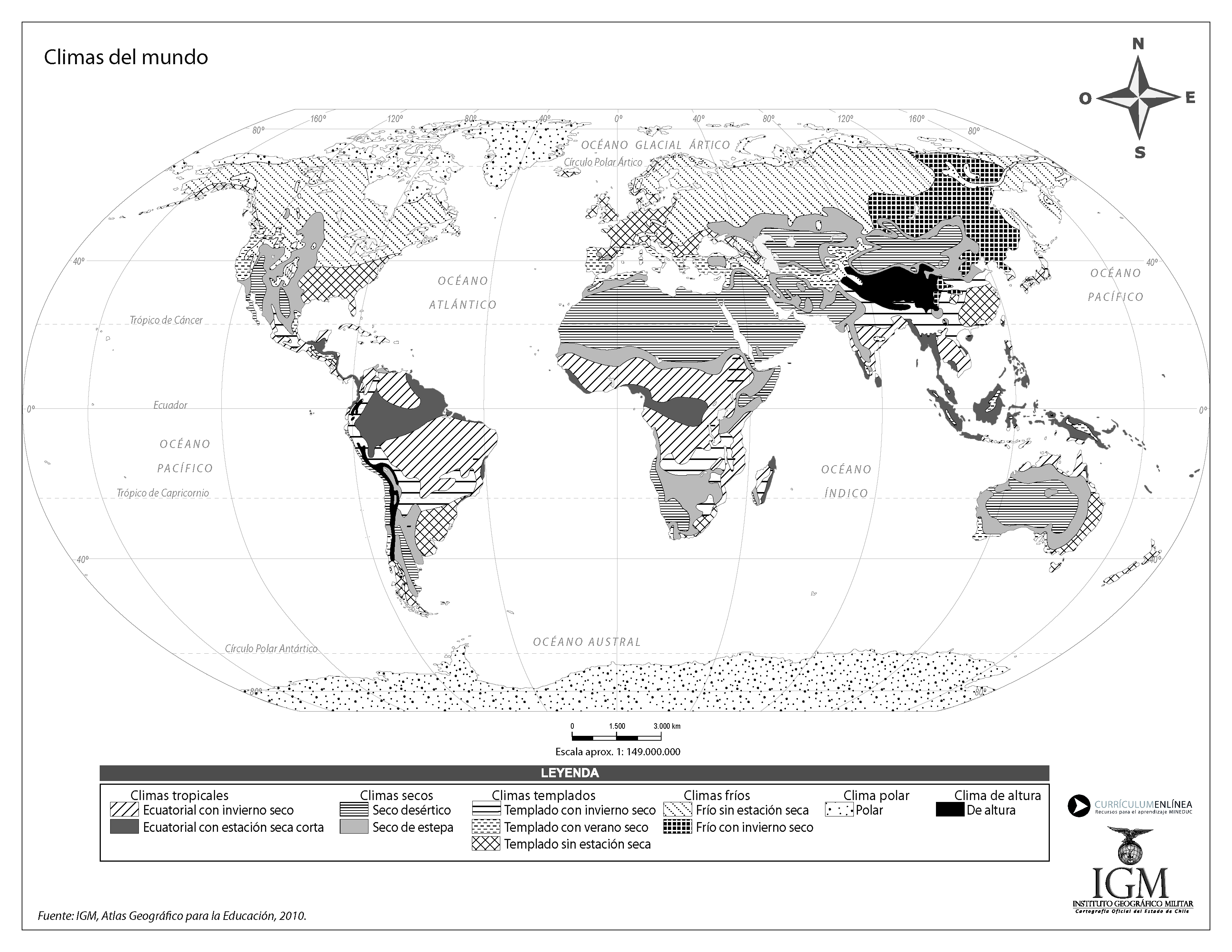 Mapa con climas del mundo en blanco y negro