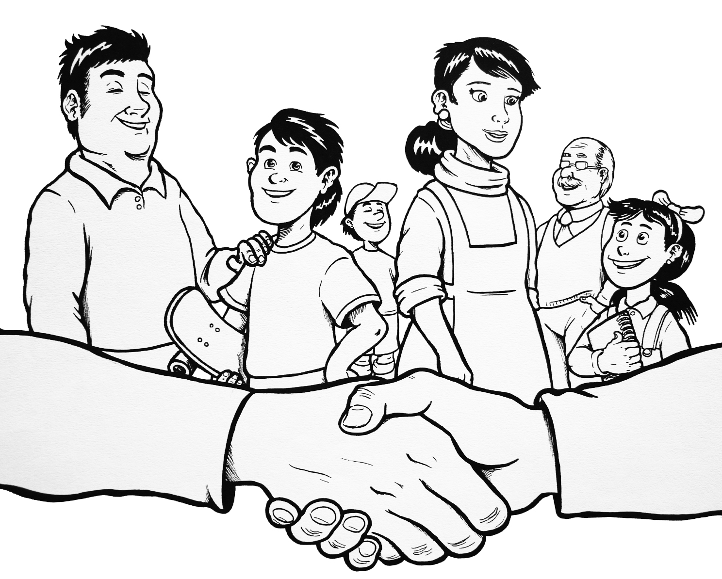 Ilustración que representa la acción de dar la mano como signo de respeto por un acuerdo (blanco y negro)