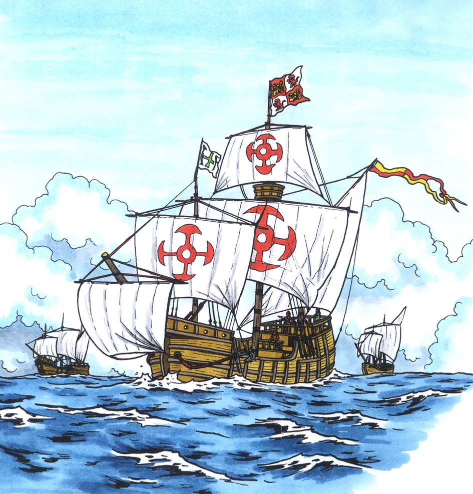Ilustración que representa el viaje de Cristóbal Colón a América en sus carabelas (color)